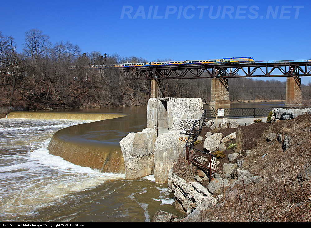 VIA 72 crosses above the unique "S" shaped dam on the Grand River in Paris, Ontario.