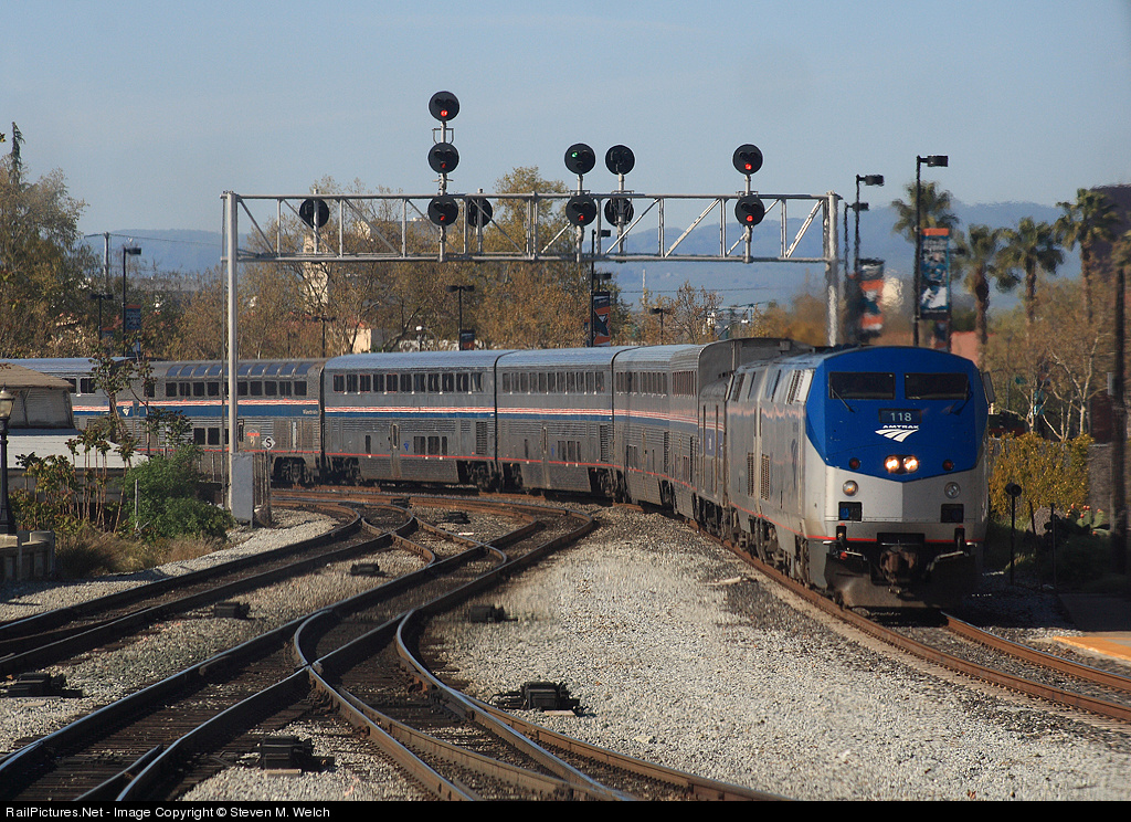 | A 6-hour late Train 11 finally arrives into San Jose just as Train 742 departs on a clear. Shot with permission from the doorway of an open door on the cabcar. |