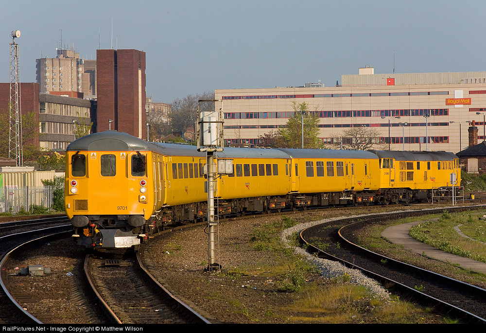 | DBSO 9701 is seen at a signal awaiting clearance to head to the south from Derby, 31285 is on the rear and the DBSO is to cut the amount of carbon emitted by these types of test train |