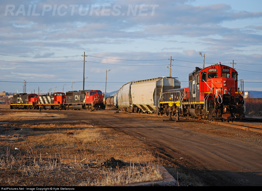 In an all GMD scene CN 7213 and its slug shove a cut of grain empties into the yard as CN 437's power backs up to its train.