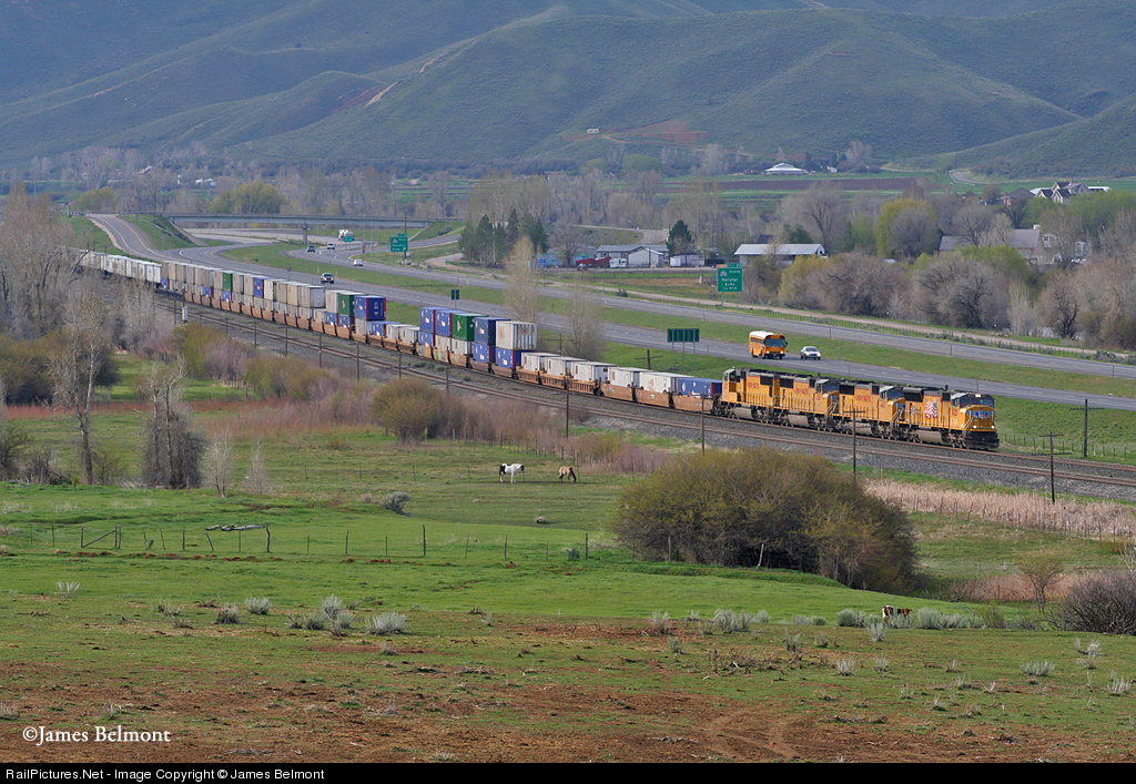 A matched set of EMD SD70M's lead Union Pacific's Canal Street (Chicago), IL to Salt Lake City, UT intermodal west through Utah's Weber River Valley near Henefer.