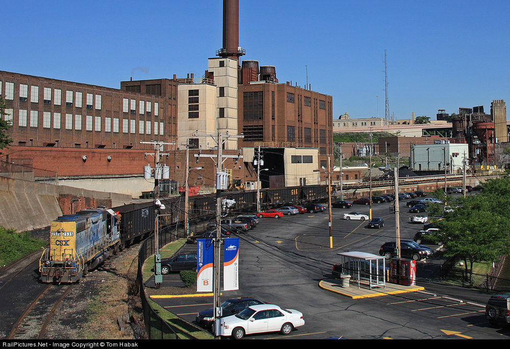 | Y190 shoves back on a cut of empty hoppers it has just pulled out of the Cleveland Thermal steam generation plant, which sits just below the Cleveland Indians' Progressive Park on the east bank of the Cuyahoga River. |