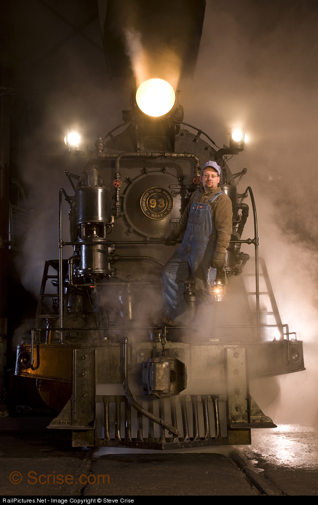 | Nevada Northern volunteer Kurt Dietrich strikes a very heroic pose on locomotive # 93 inside the Nevada Northern engine house. In this scene we had Kurt holding a brand new lantern that is still manufactured by the Adams & Westlake Co. and features the initials of the railroad etched into the globe. It should be noted that our decision to shoot inside the engine house was due in part to a defect that developed with one of the bearing on the # 2 driver of engine 93. We decided it would be best to limit the movement of the engine so we just lit her up with strobes inside the building. In looking back on our lack of being able to shoot at a location in the yard or at the station, I cannot complain very much at all about the results we achieved shooting inside the engine house. I hope Kurt didn’t get into trouble spending his Valentines’ Day evening in an engine house instead of with his sweetheart. Feb. 14th, 2009. © Steve Crise Photo. Scrise.com |