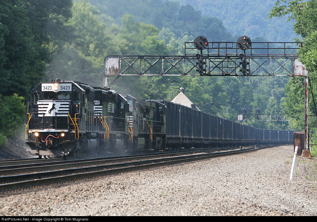 | Dumping plenty of sand and working hard is NS 3423 helper ahead and for good reason!... gives the 65J Trash train some added help up the mountain just east of Tunnel Hill @ CP MG... This extra power was cutoff at Cresson. |