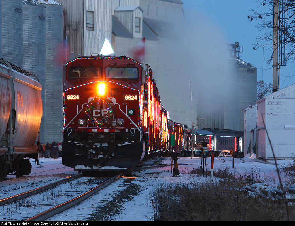 Canadian Pacific's Holiday Train cools its wheels in Elbow Lake as the local elevator's grain dryer blows off some steam.