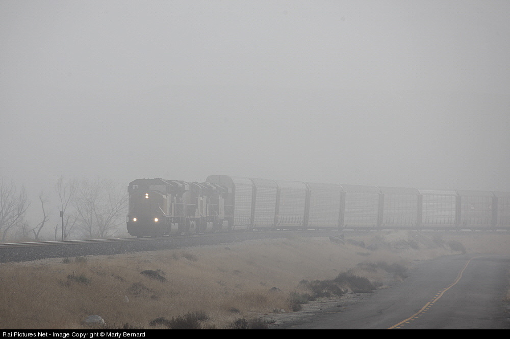 So coming down from Tehachapi Loop last Thursday (12/17/09) through Bealville and Caliente it's a bright sunny morning then a couple miles west and bang -- Central Valley fog. The BNSF Bakerfield Sub Dispatcher is talking the Amtrak San Joaquins through the fog saying things like, "I will have no meets for you until Wasco." This is UP 8043 leading a mixed freight at Ilmon (I know because I took bright sunlight shots of the train at Caliente) .