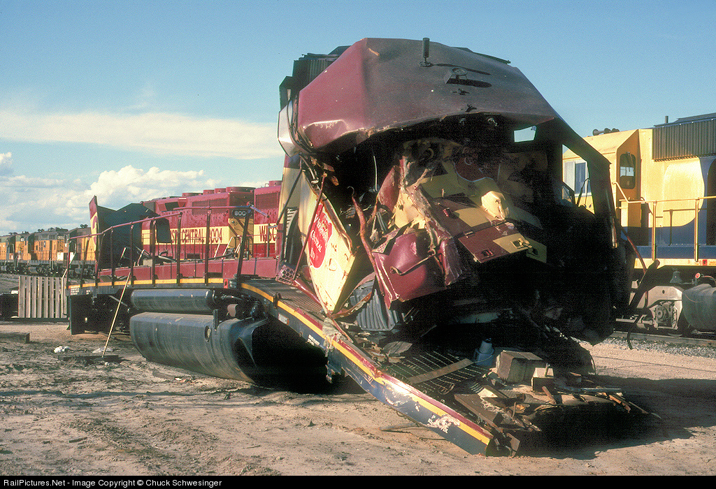 Last remains of WC 3015 wait to be cut up for scrap at N. Fond du Lac. This unit was trailing 3009 on a freight coming into Green Bay when they had a head on collision with SW1500 1561 on a switch job. The 3009 suffered less damage and was repaired along with the 1561. This unit was the worst of the bunch, with serious nose damage and a bent/broken frame just in front of the fuel tank. The unit was striped of all available parts for use on another rebuild project and this was what was left about 4 months after the incident.