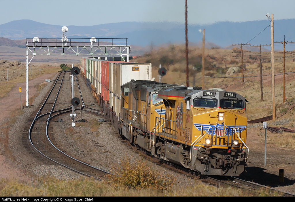 | One of UPs newest locomotives, just a couple years old, 7914 and two SD70M cousins are having no problem with this stack train. |
