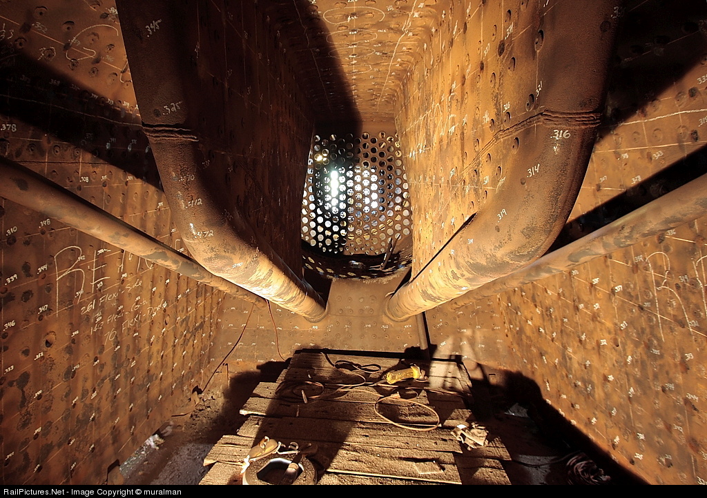 | View from inside 1225's boiler looking forward from the backhead. Note that the firebox has been marked with thicknesses measured using an ultrasonic thickness gauge. Picture taken with a Canon 10-22mm lens. Thanks to Nick, a volunteer at SRI, for the excellent tour. Visit project1225.org to help them out with this rebuild. |