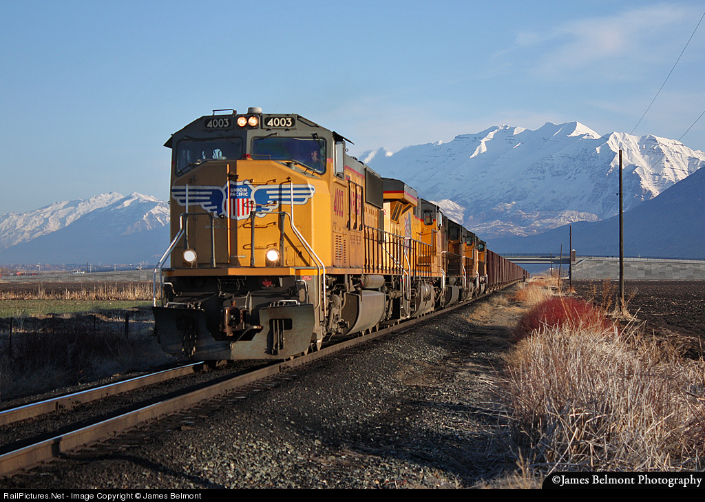 A Union Pacific Herzog ballast empty is captured in early morning light through pastureland at Springville, Utah. The 73 car train from the Green River, Utah area is headed west for reloading at a gravel pit near Murdock, Utah. 11749 ft. Mt. Timpanogos looms at the north end of Utah Valley.