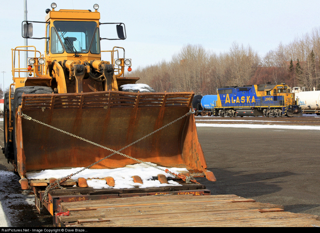 | Cats and Geeps - One of the ARR Maintenance of Way department's big excavators sits on a flat car up against the end ramp in Anchorage. Anchorage TOFC employees will unlash and unload the big machine on Monday morning. Meanwhile, a GP38-2 idles in the short yard awaiting it's next call to duty on this lazy Sunday morning. Note: the photographer is a railroad employee with permission to be on the property and was wearing all required PPE while taking this photograph. |