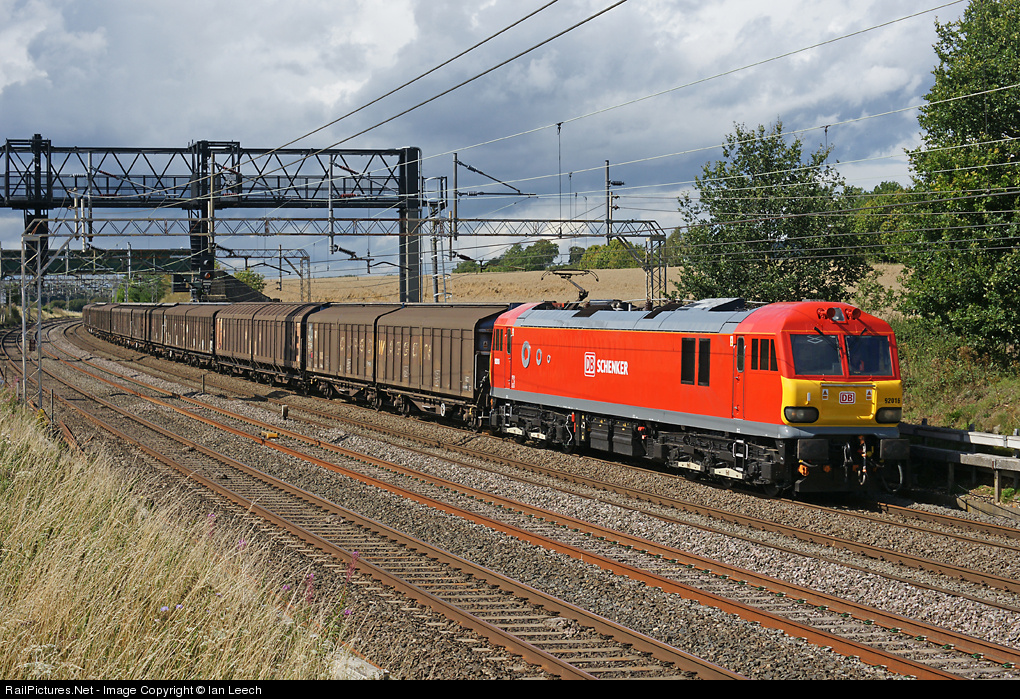 | 92016,in its new coat of DB Schenker red paint,passes Cow Roast on the Daventry to Dollands Moor empty bottled water train under threatening skies. |
