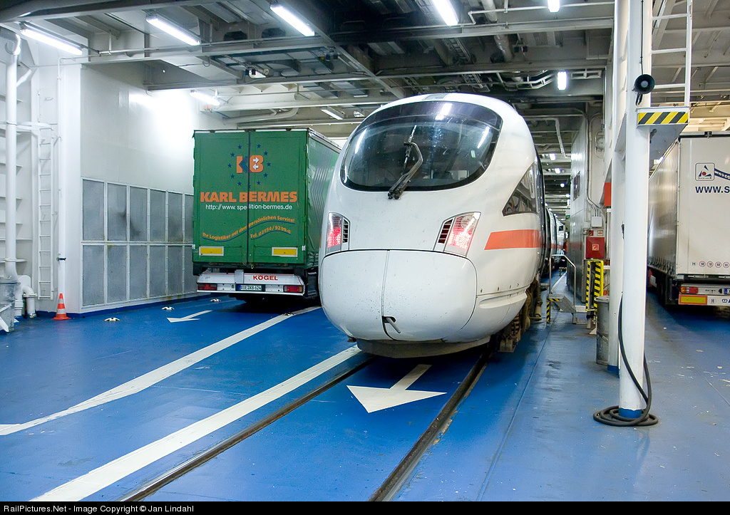 A DB 605-class trainset rests aboard the train ferry from Rødby, Denmark, to Puttgarden, Germany. The train is en route from Copenhagen to Berlin. The ferry ride takes some 45 minutes and during the crossing passengers take a quick meal in the resturant of the ferry.