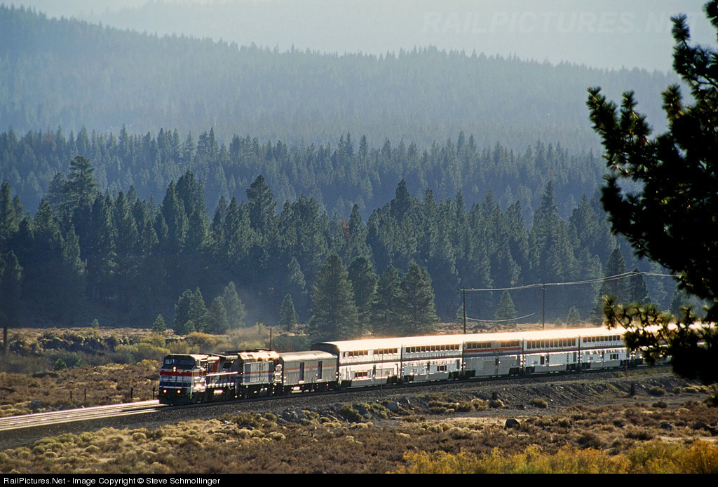 | On a clear fall afternoon in the Sierras, Amtrak train No. 6 accelerates out of Truckee after picking up passengers. In the early part of their career, Amtrak placed its GE "Pepsi cans" on the California Zephyr until they were bumped by the AMD-103s. |