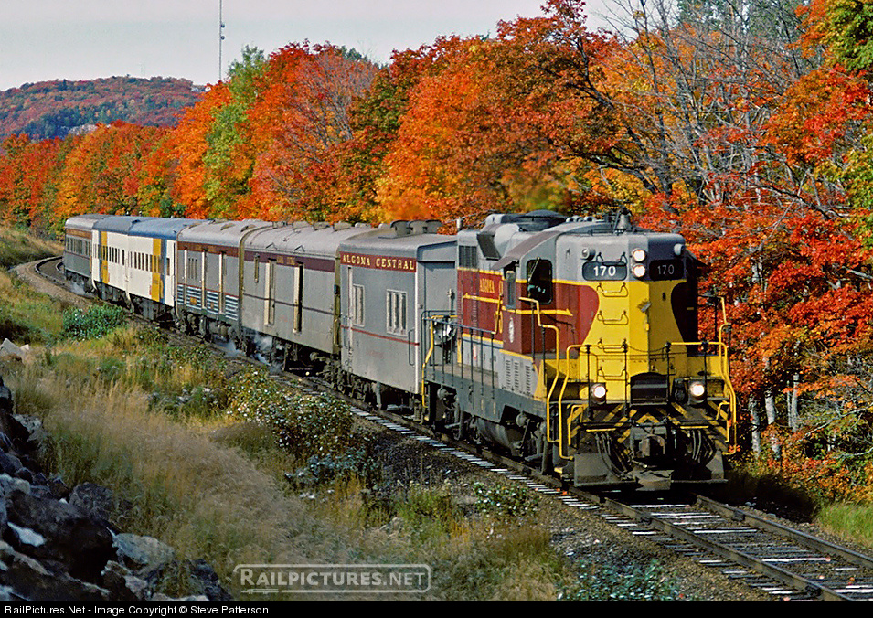 Algoma Central's daily Train No. 1, led by GP-7 No. 170, is near M.P. 22 (near Northland, Ontario, Canada) in fall colors on Sept. 30, 1993 with frost on the crossties. The train is en route Hurst (end of the line, 295 miles from Sault Ste. Marie) and will return the next day as Train 2. Note steam heater car behind the Geep.