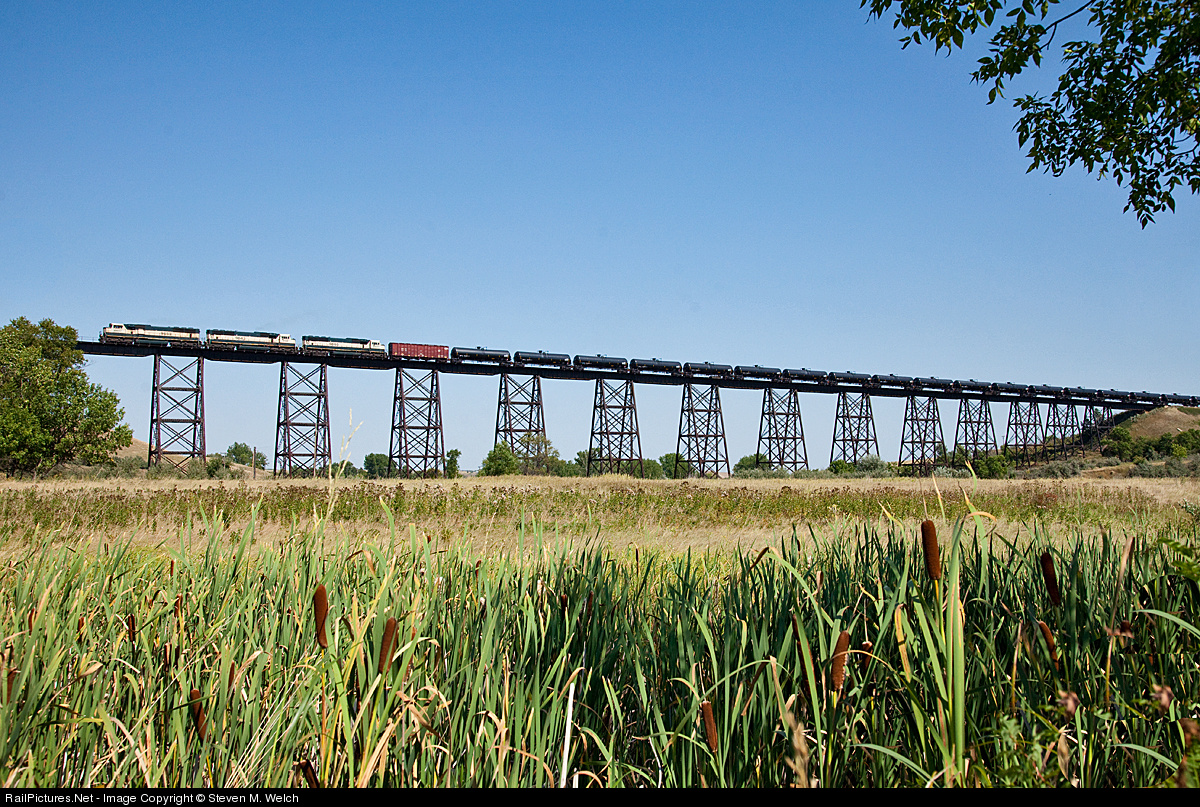 Empty tank cars from St James, LA via the UP cross the spectacular Gassman Coulee Trestle on a dazzling Summer afternoon, destined for Trenton, ND and another load of sweet Baaken crude oil; with three ex-BN "Executive" SD70MAC's on the point!