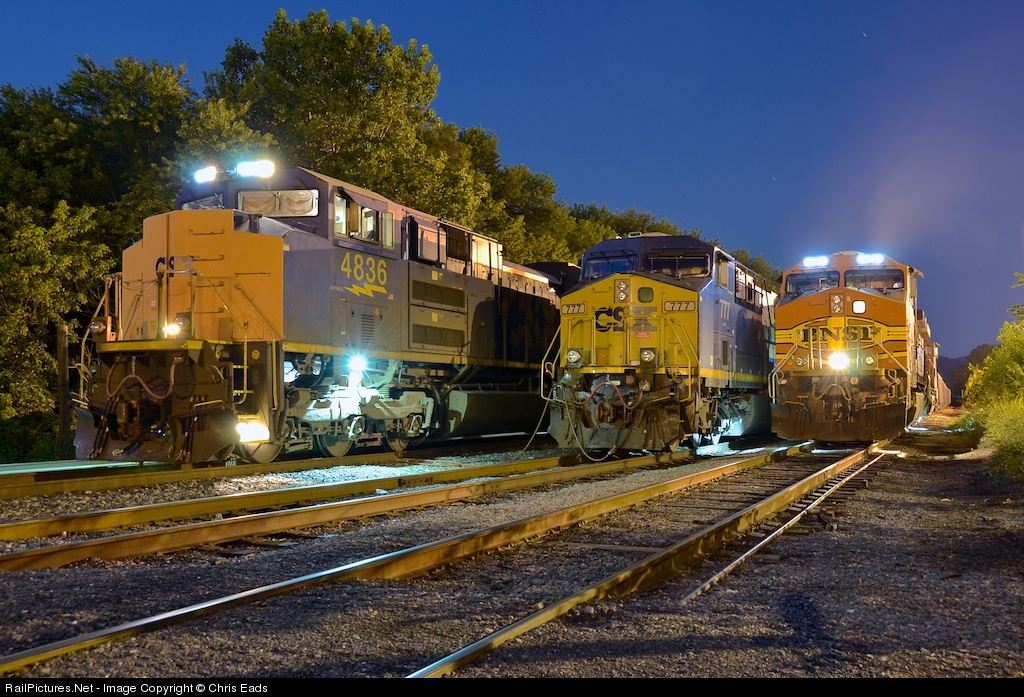 Brunswick, MD 6/30/2012 - The stars are beginning to show as a trio of trains idle in the "Mill Yard" on the west end of the Brunswick terminal. SD-70-ACe 4836 has command of eastbound Cumberland to Richmond manifest Q-401, while CSXT 777 and BNSF 5242 have coal trains. The trains have been tied here for more than 24 hours--the wiper blades on CSXT 4836 running and literally burning off--since a horrific storm called a "derecho" decemated the railroad and surrounding communities. The storm swept from Chicago to the eastern seaboard in just 18 hours, with straight-line winds up to 92 miles per hour, and was responsible for 22 deaths. The CSX mainlines in the east were tied up with downed trees and power lines for several days. 60 second exposure, ISO 200, f/6.3.