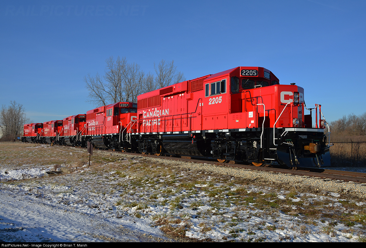 CP GP20C-ECO #2205 is the leader of a 5-unit lash-up being prepared for delivery. In this view from front to rear are 2205, 2206, 2208, 2203, and 2201.
