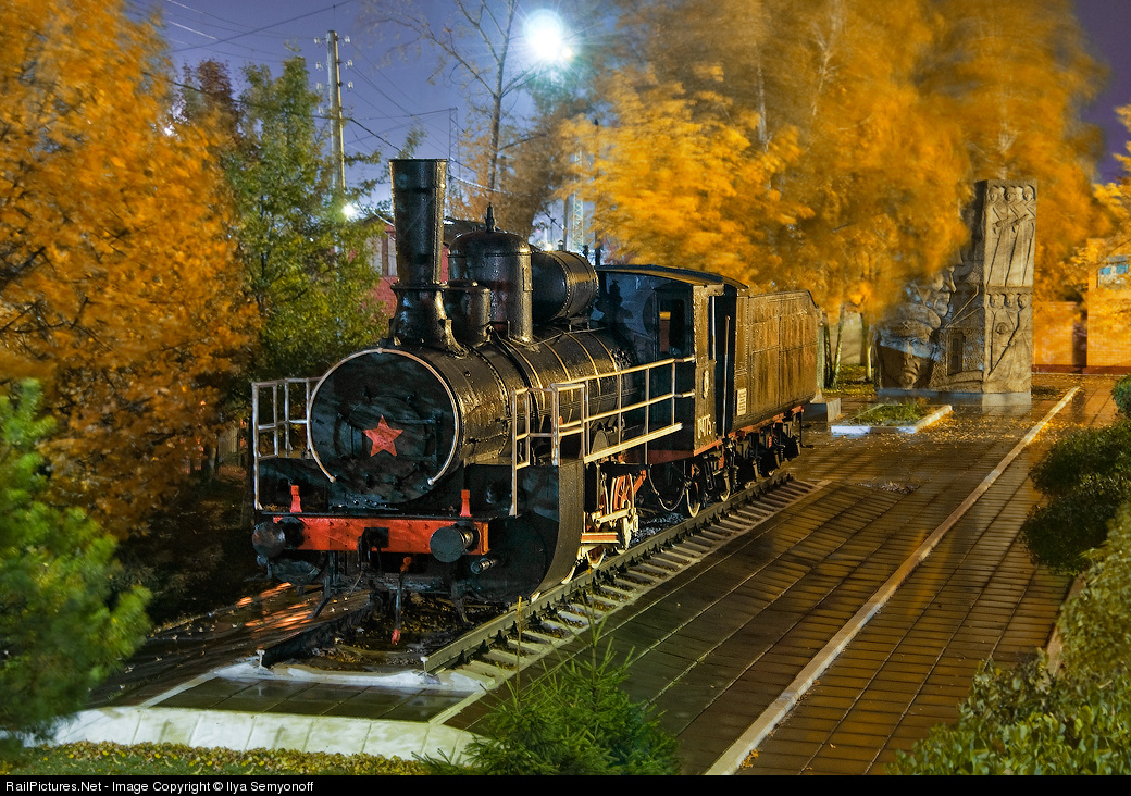 Steam locomotive class "Ov" stands on a pedestal in Orel city at the station. The Russian steam locomotive class "O" (from Russian: "Основной" - Main) was an early type of Russian steam locomotives. Between 1890 and 1928, 9129 locomotives were built; hence it was second most numerous locomotive class in Russia, after E class, what was unique number also in the world's scale. On the background stands the monument for heroes of the Great Patriotic War (II World War). Steam Locomotives "O" played a significant role in a victory of War. Trees swayed by strong wind...