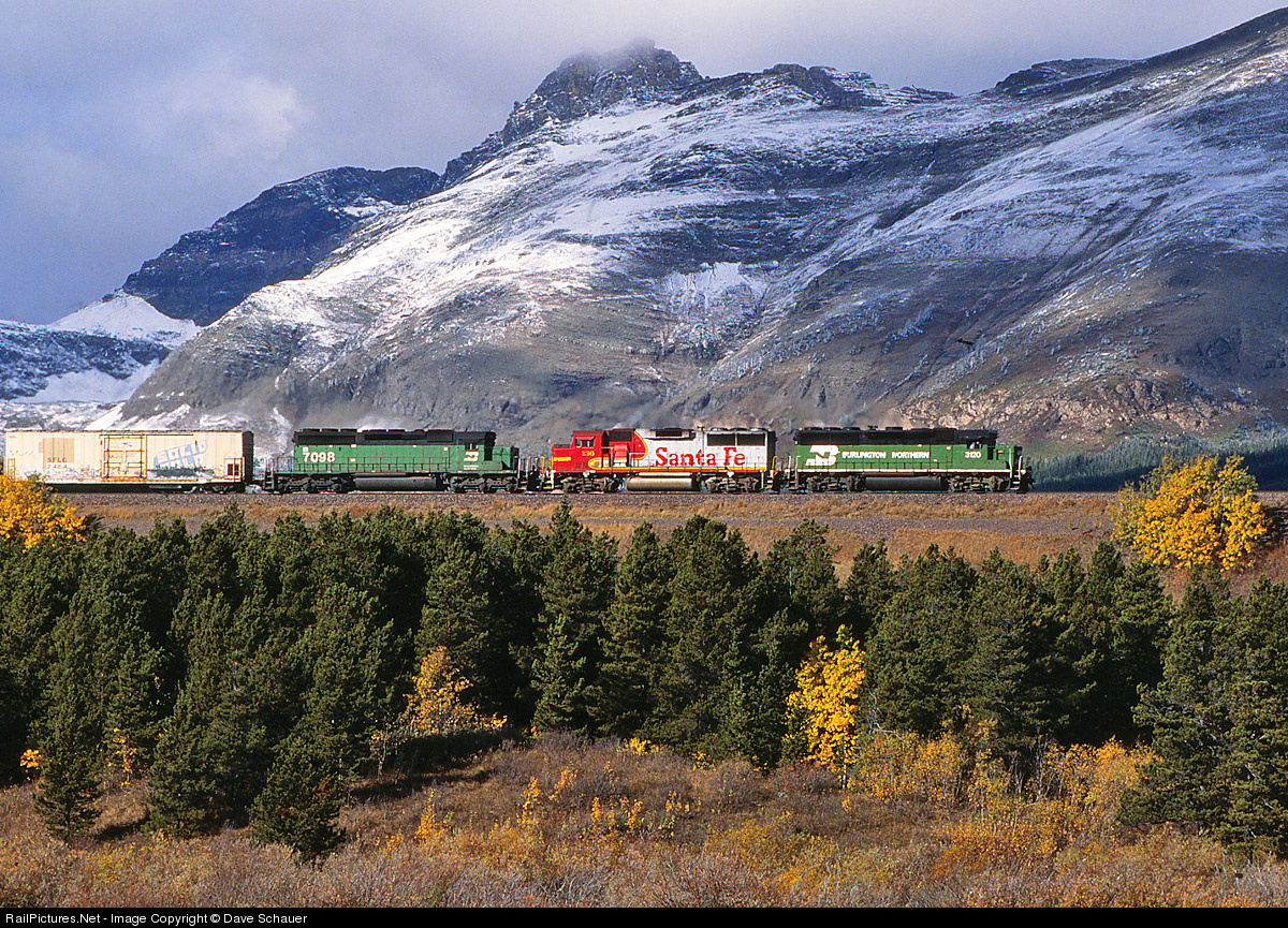 Easbound freight on a colorful Marias Pass in 1998. The Santa Fe paint added to the color.