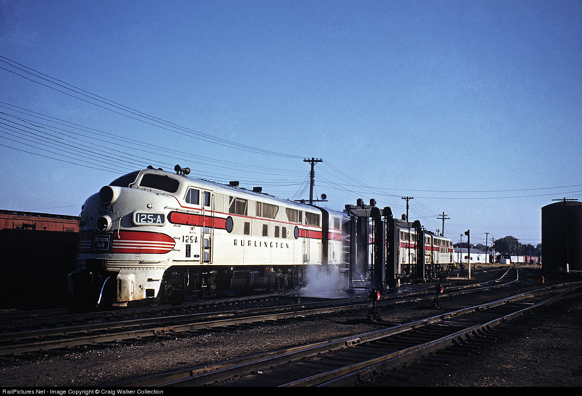 An A-B-B-A set of F3 diesels gets road grime washed off in Galesburg, Illinois, on a sunny October 1959 day. F3A 125-A must have been the trailing unit of the set, as the engine's coupler cover is still open (and lead unit 117-A had its coupler cover closed). Burlington's freight F-units wore this simple, yet attractive, light gray scheme, while the passenger Fs were painted silver. (Frank "Woody" Woodburn photo, Craig Walker collection)