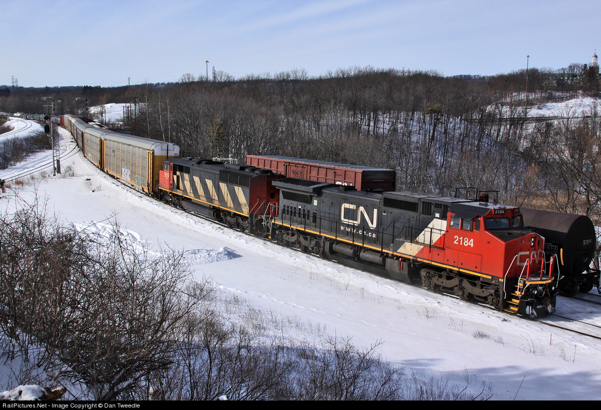 | CN 2184 leads CN 5519 down the Dundas with 382s train. Going up on the north track is a very late 385. Heavy snowfall throughout Southern Ontario delayed trains and interrupted crew start times making most night trains shootable in broad daylight, twelve hours behind their regular time. |