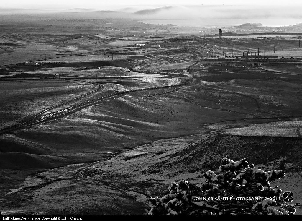 Snaking along is a empty coal train that is seen making its way through Rocky Siding just after sunrise. Barbers Gulch and Chemical can also be seen in the background.