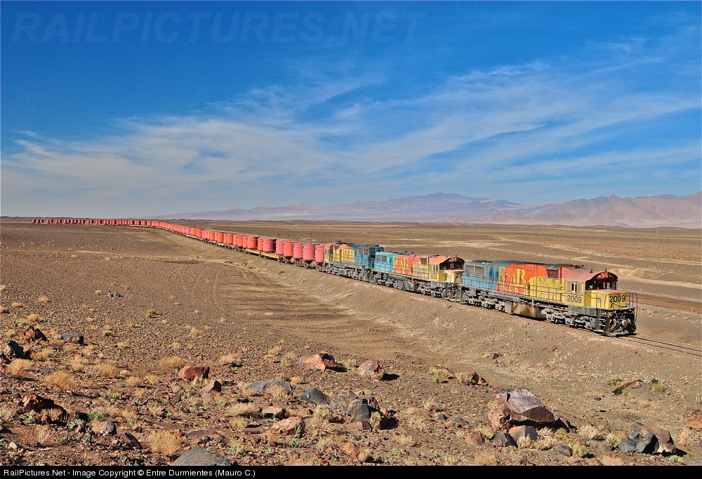 Formation of the Chilean railway company FCAB, coming from the seaport of Mejillones, and a large crossing, heading towards Ollagüe, a town located on the border with Bolivia to almost 4000 meters. This train has been shipping containers minerals: silver, lead and zinc from the "San Cristobal" mining company of Bolivia. In Ollagüe comes loaded train Bolivian minerals, and they exchange cars, so that the load is going to seaport and be exported. In the picture, the FCAB train near the highest point of the voyage, the "Ascotan Pass", a wonderful environment surrounded by salars, volcanoes, and where the clouds hug you.
