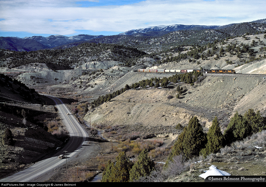 Rio Grande lumber drag 126 climbs through Detour in Spanish Fork Canyon on March 20, 1988. US Highway 6 follows the path of Soldier Creek near the old Tucker rest stop. The highway was relocated here a few years ago bypassing a pair of 40 mph curves. The original highway location was built on top of an old abandoned D&RGW right of way after the 'Detour' realignment was moved to the hillside early in the 20th century.