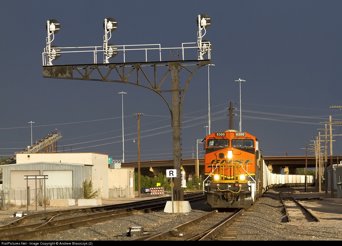 | Under some awesome storm light, BNSF 6300 passes the ex-ATSF cantilever signal guarding Canyon Junction. The train will cross over both mains to make the turn east up the Plainview Sub. |