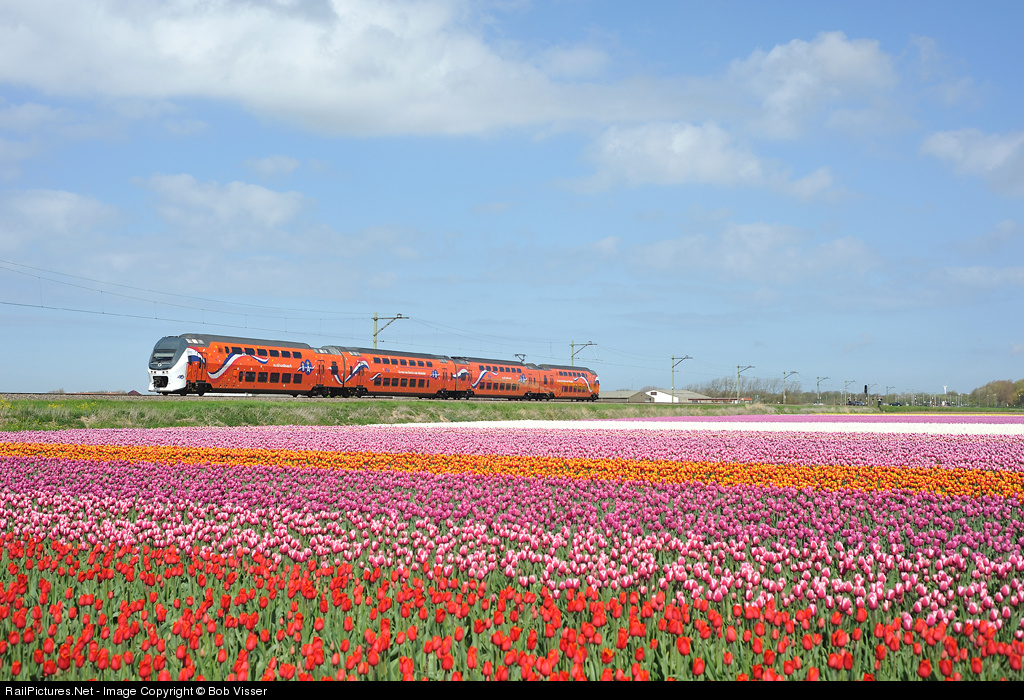 This NS VIRM has got a special paint scheme on the occasion of the inauguration of King Willem-Alexander on April 30th. Here it leaves Den Helder Zuid for Nijmegen. On the foreground tulips for export.