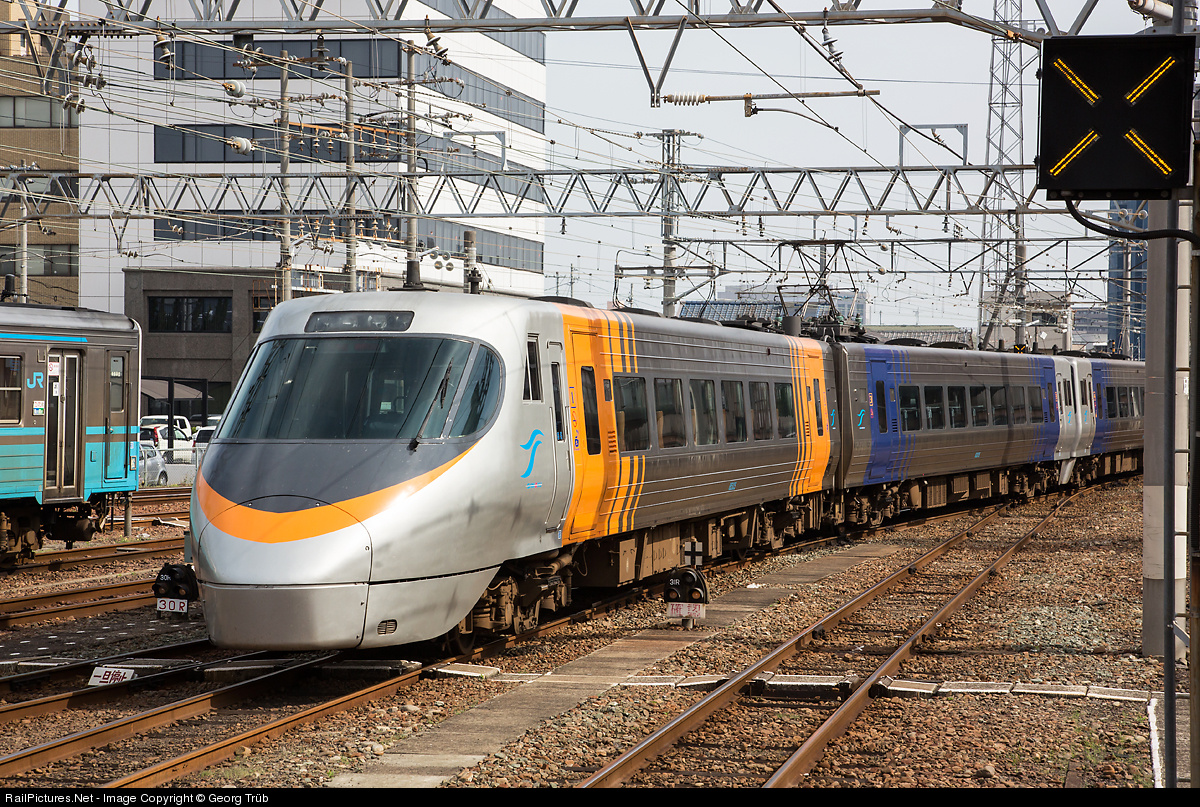 Electric multiple unit tilt train series 8000 of JR Shikoku in Matsuyama station. This trainsets for Limited Express services "Ishizuchi" and "Shiokaze" were built by Hitachi and Nippon Sharyo from 1992. They run with max 130 km p.h. on cape gauge of 1067 mm.