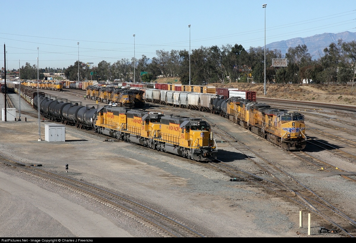 | An extremely rare leader in a very familiar package leads an extra Fresno while a trio of rebuilt SD40Ns working the 7:30 trim job pull a cut from the bowl. The rare leader, UP 5695 is one of the original pre-production GEVO order, before they were GEVOs or ES44ACs, and although it is now an ES44AC it wasn't when delivered. |