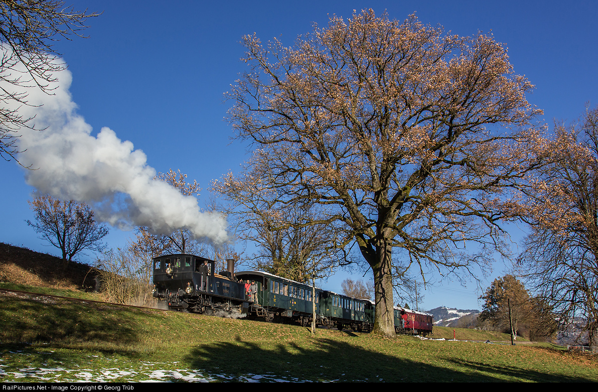 | On the occasion of the Christmas market in Ritterhaus Bubikon, a steamtrain of the DVZO with locomotive Ed 3/3 # 4 circulated on the never electrified former Uerikon-Bauma Bahn section between Bubikon Ritterhaus and Wolfhausen. The steamlocomotive "SCHWYZ" was built in 1887 by Emil Kessler/Germany for the Wädenswil-Einsiedeln-Bahn and is one of the oldest operational steamlocomotive in Switzerland. |