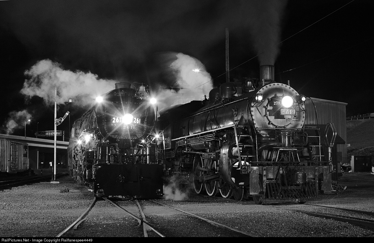 | Schenectady graduates Milwaukee Road 261 (1944) and Soo Line 2719 (1923) shared the stage in a night photo session at the Lake Superior Railroad museum in Duluth. |