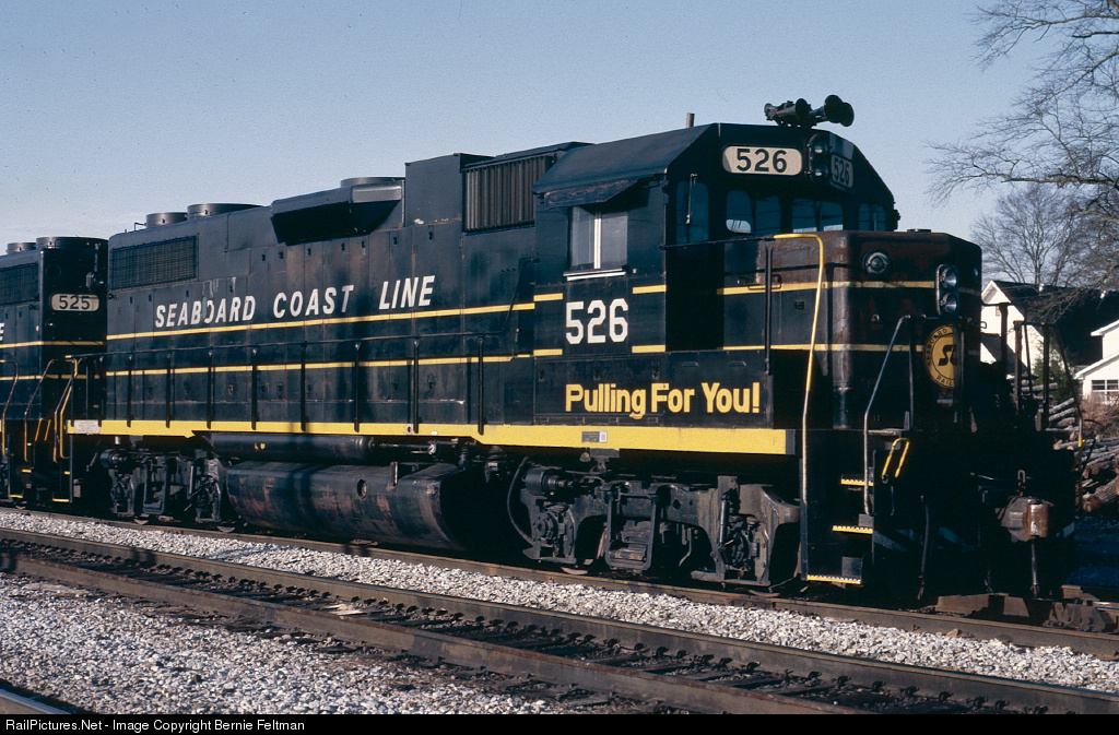 Seaboard Coast Line GP38-2's # 526 & 525, serving as power for the Lineville Road Switcher, sit on the Outside Track across from the depot. #526 was built October 1973 and later became Seaboard System #526 and later SBD/CSX #2526