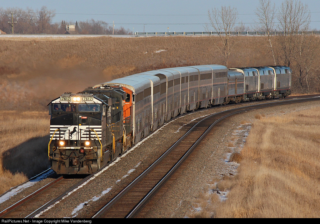 | It just so happened that today's eastbound builder was the next train behind a 93 car manifest that derailed and blocked both main tracks in central Minnesota. With most of the passengers moved to bus transportation at Detroit Lakes, a trio of GEs off an ebound oil load tow Amtrak back to Dilworth on a brisk afternoon. |