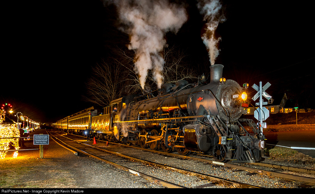 At North Pole Station. Engineer Ken Blandina gets the lantern signal from his Conductor that his locomotive has been decoupled from the passenger consist, and he may now pull forward to begin his run-around move. This is the Valley Railroad's North Pole Express Number 1, as it sits in the hole at the North Pole Station....known most of the year as Deep River Landing. NPE-1, as she is called, departed Essex, CT at 5PM and ran all the way to North Chester, before shoving back to Deep River. Moments before this photo was taken, NPE-1 was passed by NPE-2, another North Pole Express Train with VALE 40 on point. Now that the second train is clear of the yard, NPE-1 is free to run around and depart southbound for Essex. From mid-November to the end of December, this two-train evolution is repeated twice per night, six nights a week. Don't go looking for tickets.....there aren't any.....and haven't been for months. This event typically sells out in the fall.
