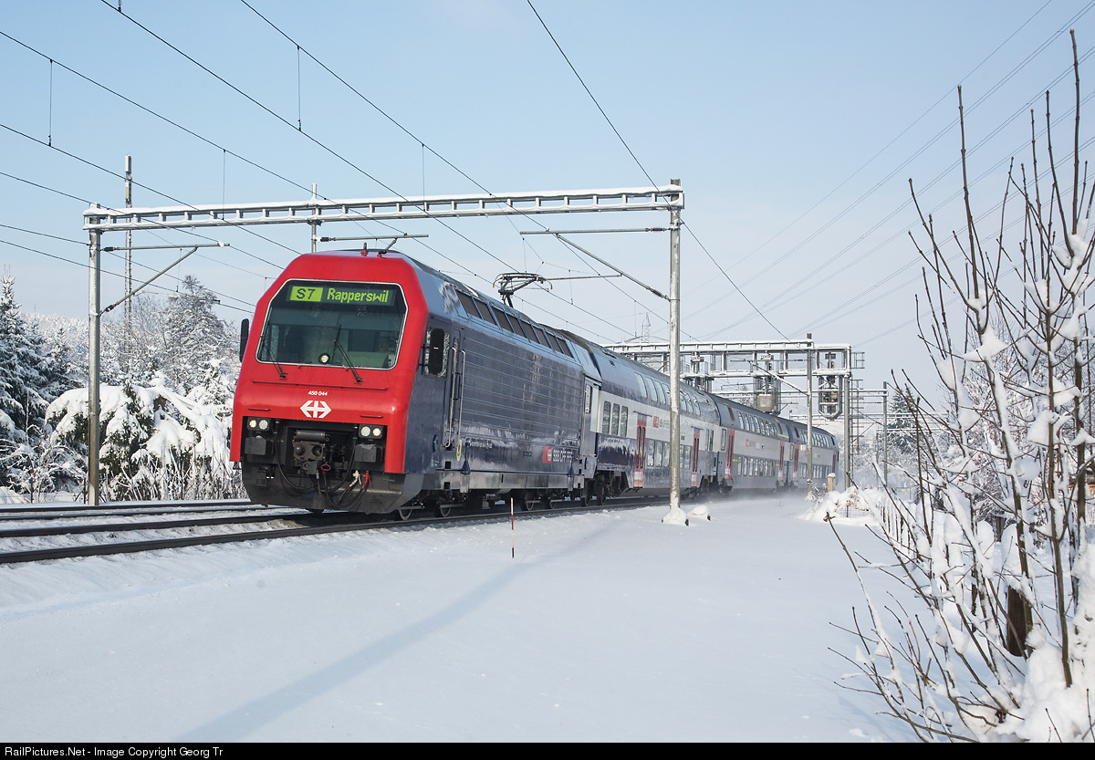 | The last day of the year 2014 was a beautiful winter day in Switzerland. Doubledeck commuter train (DPZ+) with locomotive Re 450 044 is running as S7 from Winterthur via Zürich-Meilen to Rapperswil. |