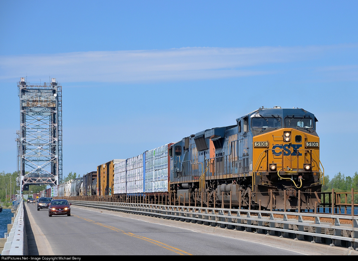 | Trains and cars sharing the bridge. CN 327 with a pair of CSXT AC units (AC4400CW CSXT 5106 and SD70MAC CSXT 4817) crosses the Beauharnois canal on the Larocque Bridge which is used by both cars and CSXT (this is their Montreal subdivision). As can be seen in the distance this is a lift bridge, in fact both cars and CN 327 had been delayed by a boat just before. |