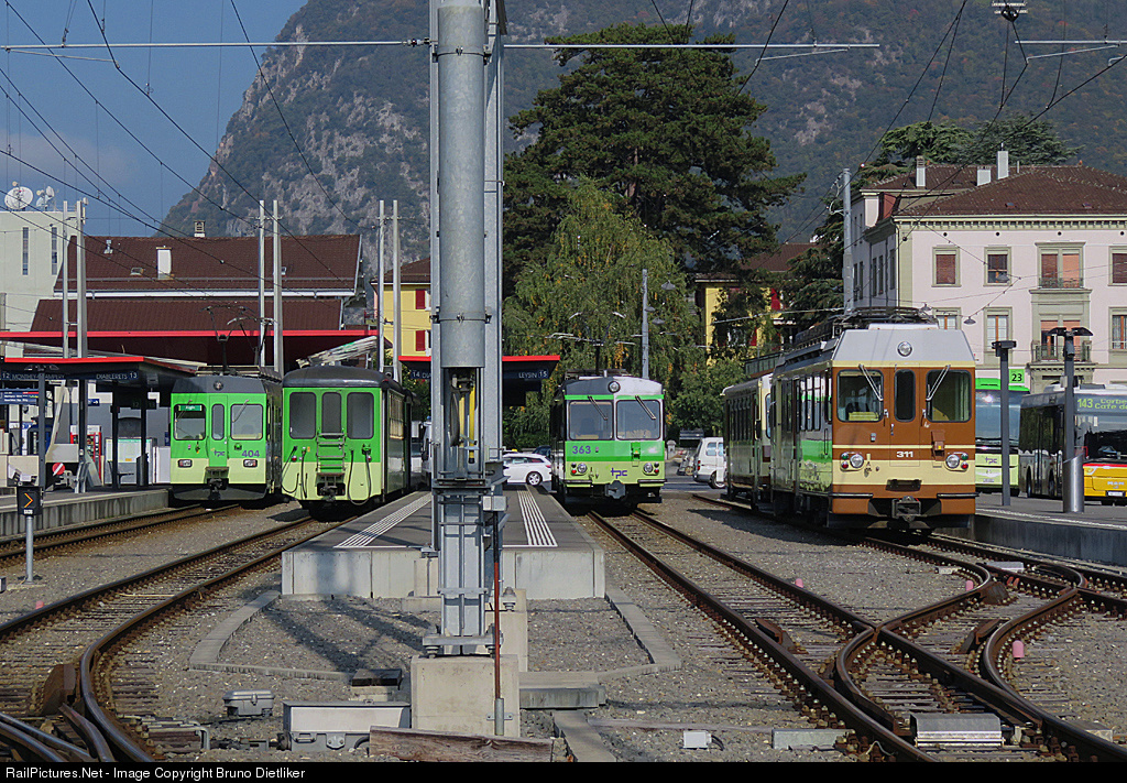 | Rush hour at Aigle narrow gauge station at 11.40am: From left localtrain toward Monthey Ville, parked, toward Leysin and Les Diablerets |