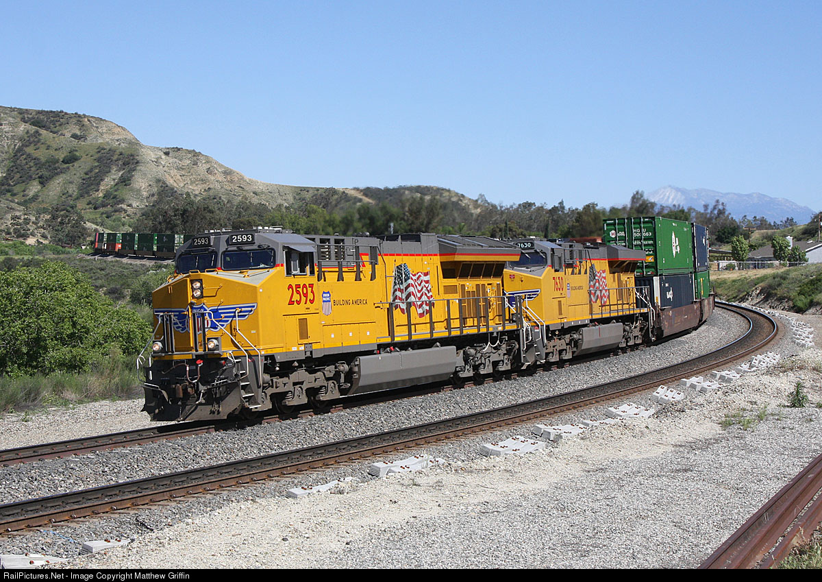 UP tier4 2593 leads the westbound ZMQLA down Beaumont Hill between Ordway and El Casco.
