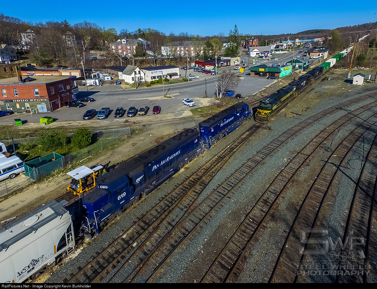 Norfolk Southern/Pan Am Southern train 23Kâ27 is seen rolling into Gardner, Massachusetts, and meeting Pan Am Railways train EDP0â27, at the connection with Providence & Worcester RR. 23K is led by NS SD70ACe 1068, decorated in the Erie heritage colors.