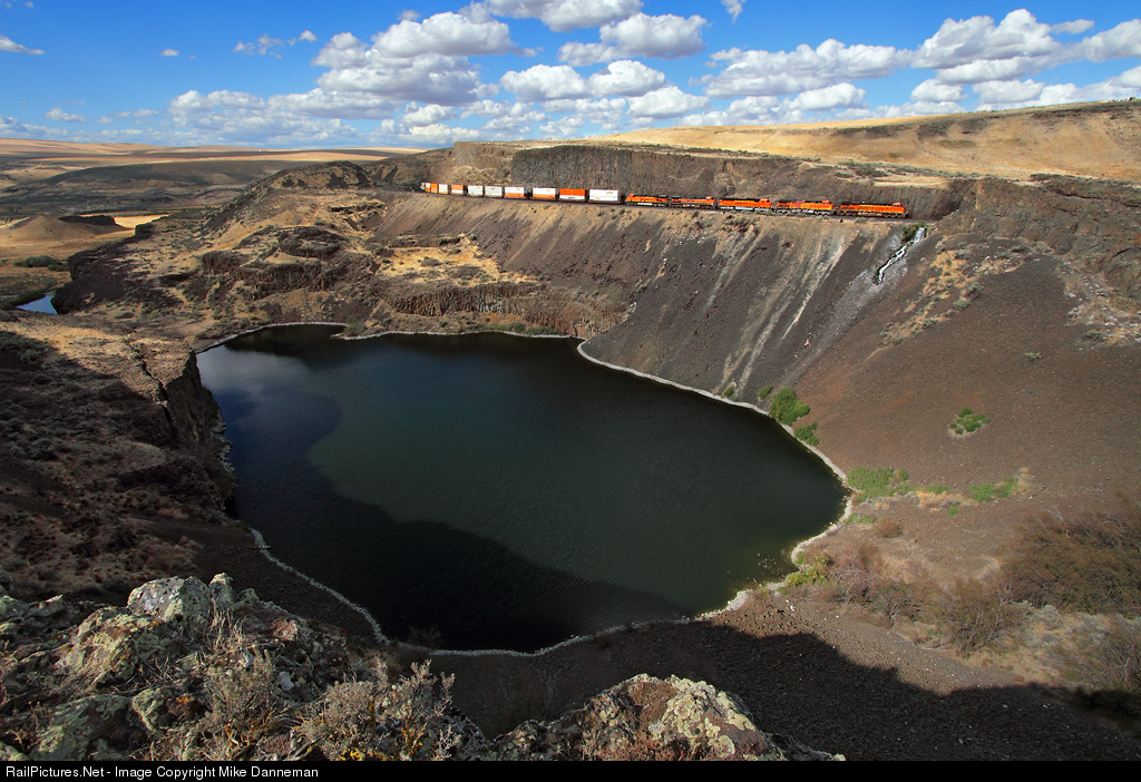 Cruising along the basalt cliffs above Crater Lake between Trinidad and Quincy, Washington, is an eastbound BNSF Z train on the afternoon of September 21, 2016. The train is climbing a grade out of the Columbia River Valley and has just finished working through Trinidad Loop.
