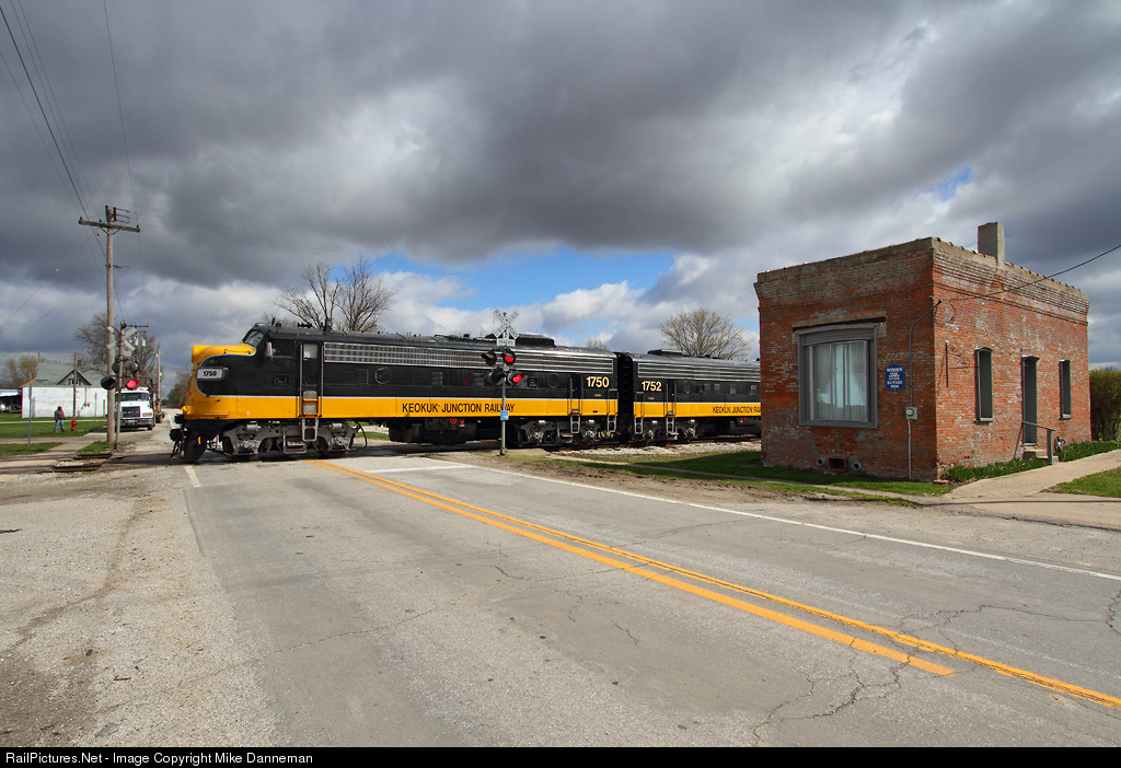 Keokuk Junction Railway FP9 No. 1750 ambles westbound across S. Main Street through Smithfield, Illinois, on April 7, 2016, passing former Smithfield State Bank.