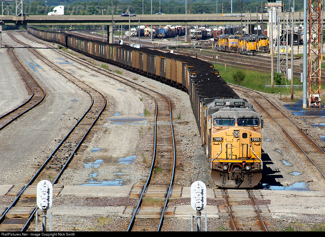 | UP 7005, an ex-GECX motor, is on the point of a loaded coal train tied down at Armourdale awaiting a crew for the trip east. |
