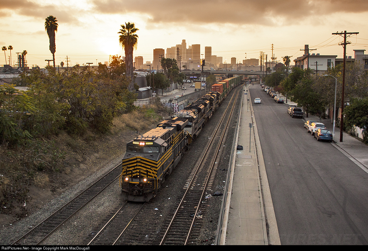 | The Los Angeles skyline provides a late evening background as ZAILC 10 arrives at LATC after completing a cross country trip from Atlanta, GA. Leading the way is specially painted NS 8100, which wears the Nickel Plate paint scheme. |