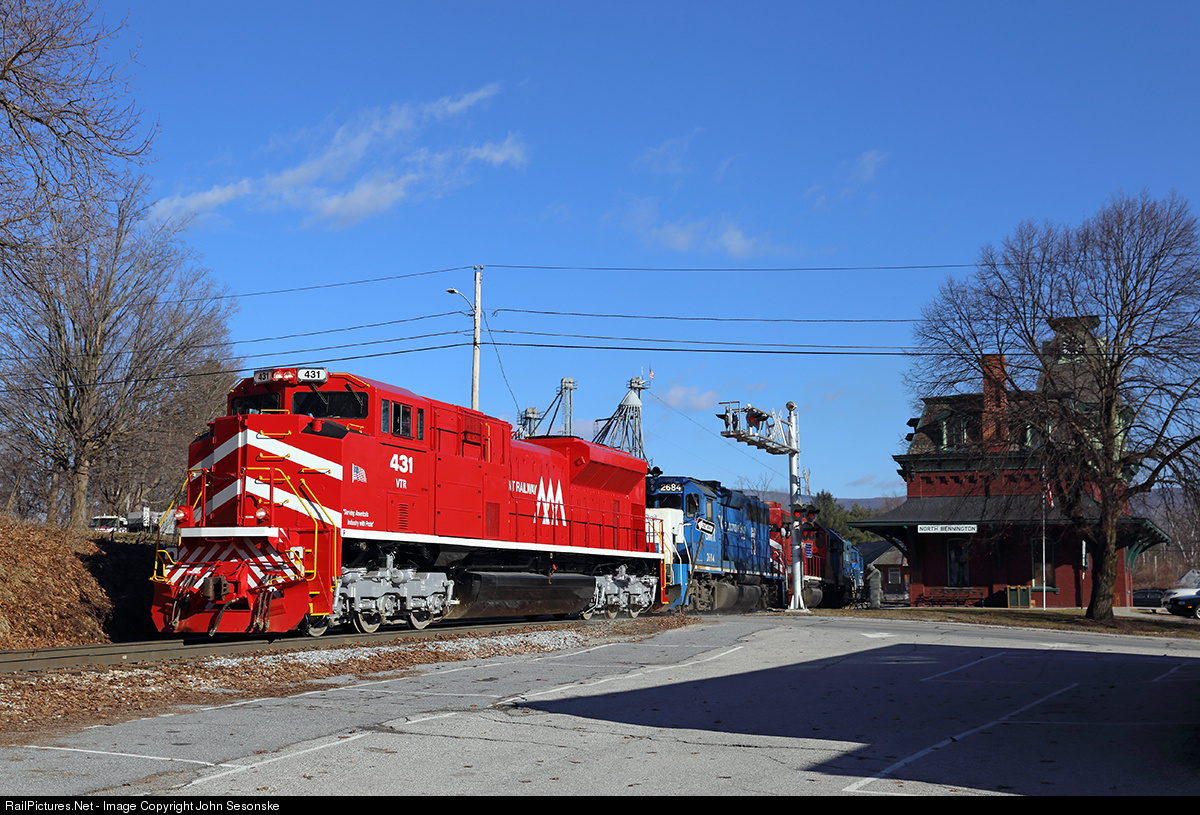 The freshly painted Vermont Railway 431 departs North Bennington after making it's first trip down the B & R Main from Rutland. The historic former Rutland Railroad station is on the right. The Sunday extra is running light power to North Hoosick where 69 loaded salt cars are waiting for pick up. The 431 is trailed by 4 lease units and the VTR 201.