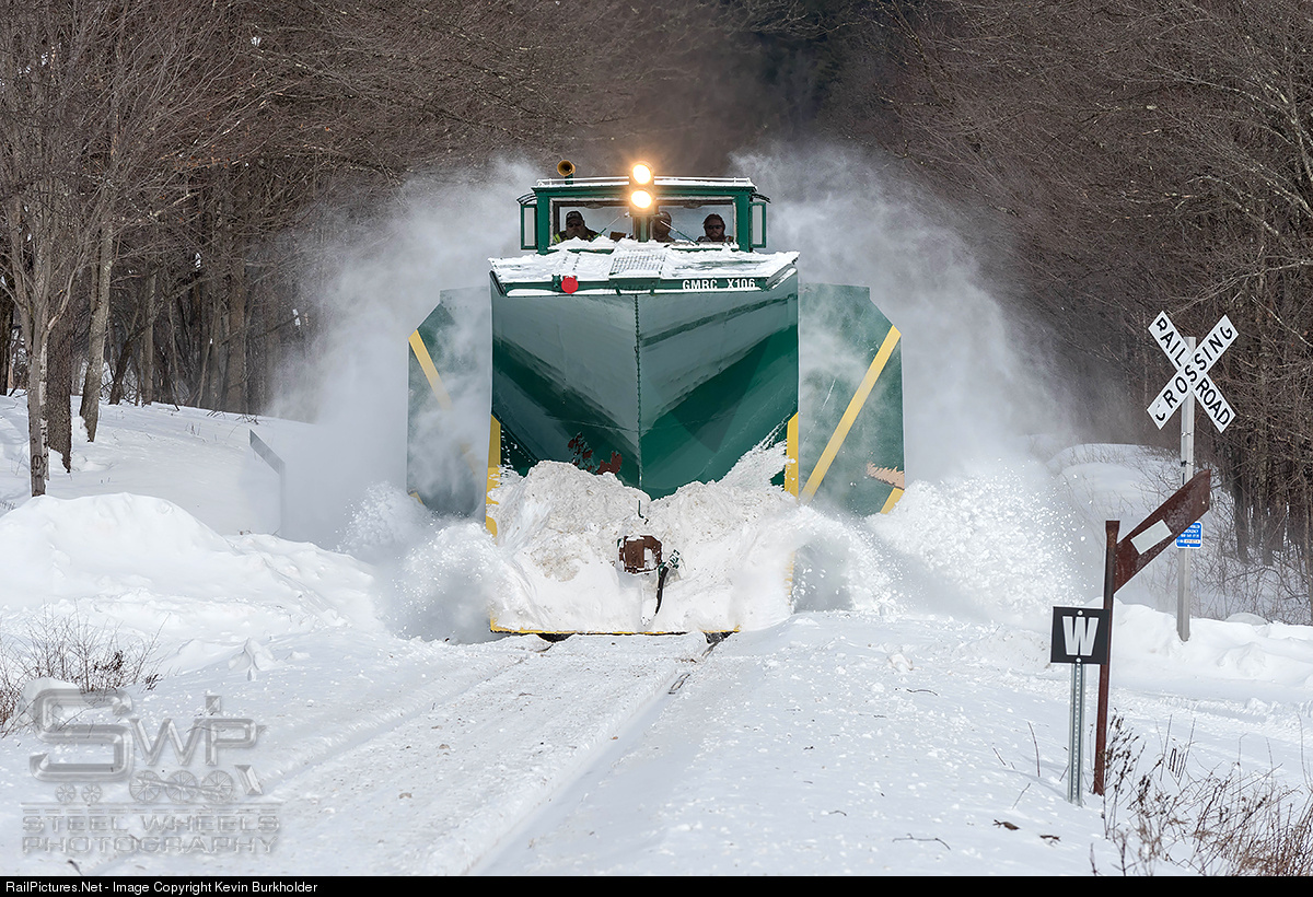 Following up Monday's Green Mountain Railroad freight #263 snow moving venture through the Green Mountains, VRS dispatched GMRC's Russel snowplow, X106, Tuesday, to clear the rest of the line and wing back the banks. The Plow Extra - shoved by GMTX GP38-2 2205 - is seen eastbound at Baileys Mills, VT.