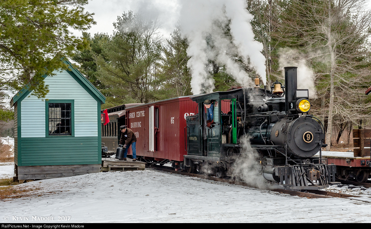 Flag Stop: Alna Center. Like a lot of rural railroads in early 20th Century America, Maine's 2-foot operations were dotted with small, rural stations at which passenger and freight traffic were sparse. Rather than schedule stops in these locations, they were instead set up as flag stops....meaning the train would stop if someone flagged it down. Such was the case on the WW&F with the site at Alna Center. In this scene, with the red flag displayed in front of the station house, a northbound mixed has stopped to pick up a shipment of raw milk from a local dairy farm. Handling the loading chores this day is WW&F Conductor Jonathan St. Mary, as Engineman Rick Sisson waits patiently in the cab of Locomotive #9.